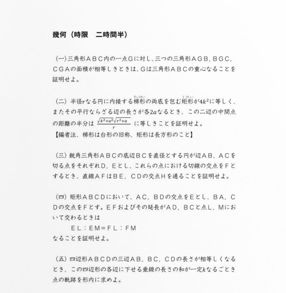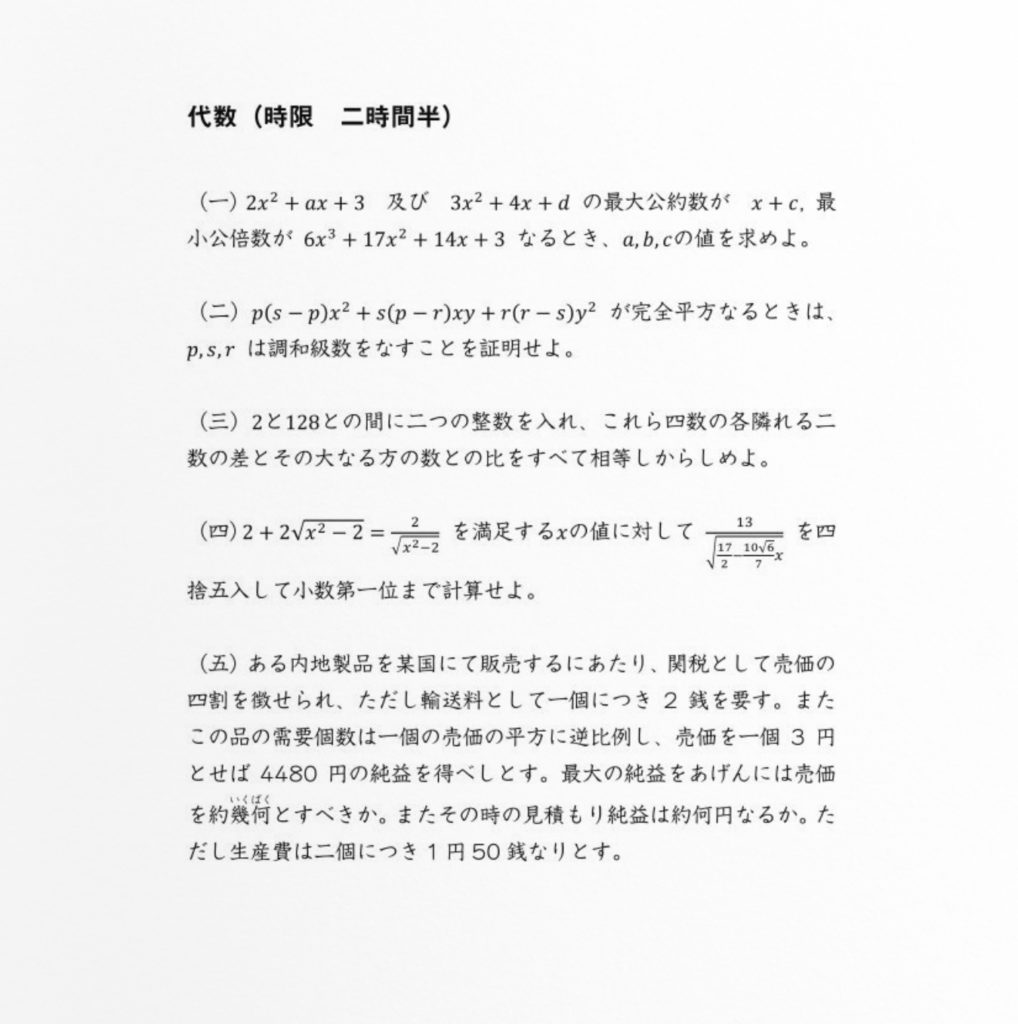 数学(幾何、代数):試験時間2時間半、